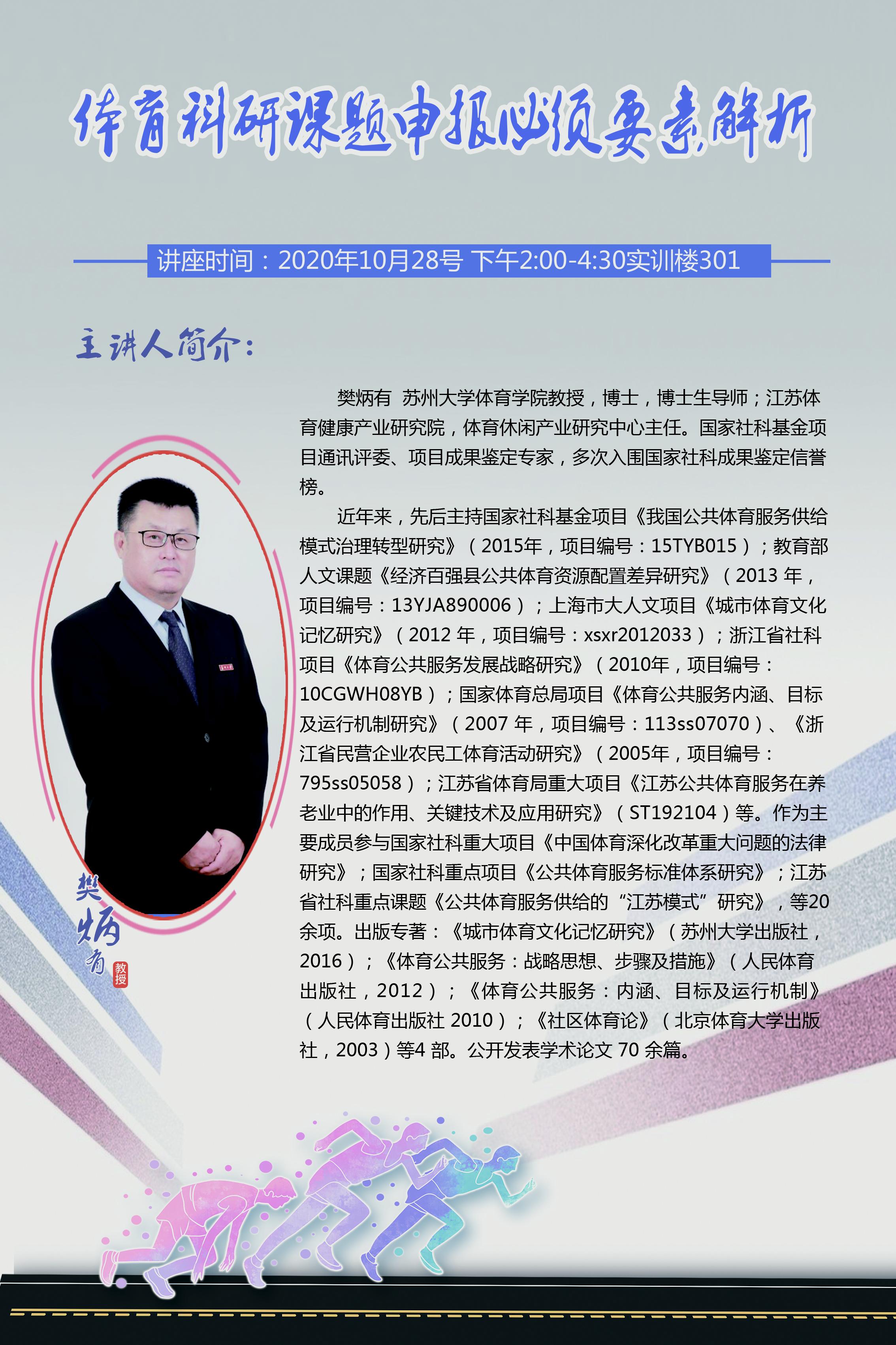 2020年10月28日下午,在实训楼301会议室公司召开了以“体育科研课题申报必须要素解析”为主题的学术讲座。本次讲座邀请到苏州大学伟德bevictor博士生导师樊炳有教授,并由伟德bevictor副经理金梅教授主持,伟德bevictor全体教师及员工参加。