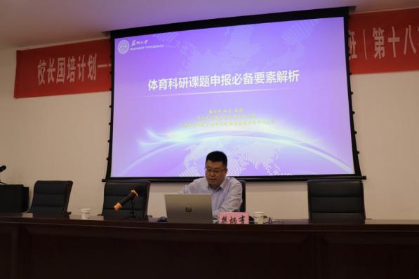 樊炳有教授首先从选题环节、文本撰写、论证环节、评审环节四个部分作了具体阐述。并就课题申报方面分享了他多年的经验。樊教授着重指出课题申报的成功在于思维的转变,强调在课题申报时要牢牢把握学术选题方向和政治方向,选题既是切入点,又是创新点,要把握其中的高度、深度、宽度、远度,文献评述要承上启下。其次,樊教授讲到,员工要在寒暑假中走出去,加强实践锻炼,并充分利用平时所学理论知识,关注目前体育行业各个方面的发展,将体育、文化、文创、旅游合为一体。最后樊教授提出:不要因为看到希望而坚持,而是因为坚持才看到希望。