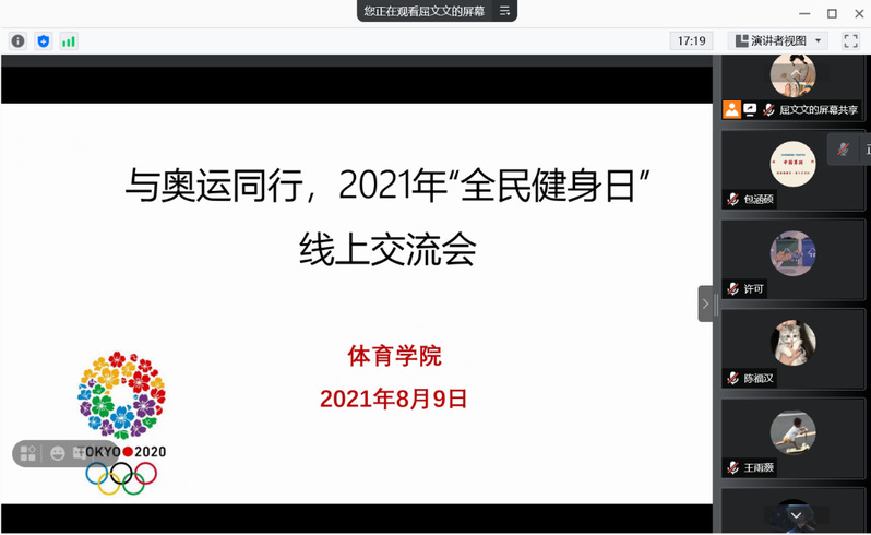 随着奥运圣火缓缓熄灭,第32届夏季奥林匹克运动会在东京新国立竞技场的夜色中落下帷幕,第十三个“全民健身日”也如期而至。为进一步诠释中华体育精神,营造全民健身的浓厚氛围,8月9日下午,公司举办以“全民健身与奥运同行”为主题的线上交流会。体育教育系主任徐五所老师、班主任和辅导员老师、以及全体员工参会。会议由辅导员屈文文主持。