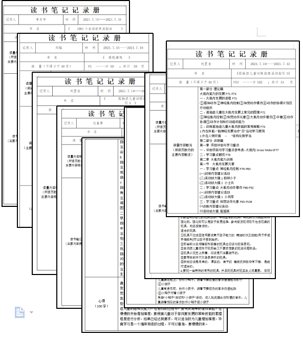 暑假期间,团队成员严格按照要求,认真阅读《孤独症儿童训练指南活动指引3》、《如何发展自闭谱系障碍儿童的认知能力》、《游戏中的教育》、《感觉统合训练教学指导手册》和《特殊儿童早期干预》等约20本相关书籍,积极撰写读书笔记,并通过腾讯会议的形式定期开展读书分享会,与其他成员互相交流、分享读书心得与体会,汲取书中精华,深入了解培智员工,深悟课程创编真谛。