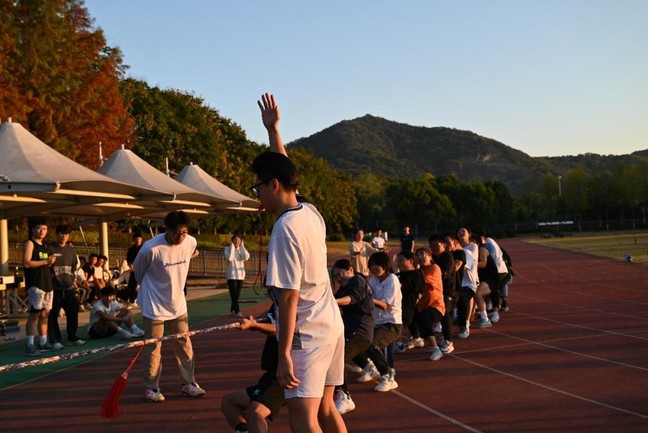 比赛分三支队伍进行。随着裁判员一声哨响,顿时加油声此起彼伏,赛场上的气氛变得紧张而热烈,队员们为了班级的集体荣誉都铆足了劲用力蹬地,在整齐划一的口号下往自己的方向拉绳子。经过激烈的角逐,最终体育2001班和体育2201班进入决赛。决赛中,双方实力势均力敌,红色标记在两队边界之间左右移动,是意志与耐力的比拼,最终体育2001班夺得比赛冠军。