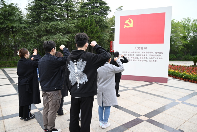 求雨山浦口革命烈士纪念碑广场庄严肃穆,在苍松翠柏掩映下,烈士纪念碑巍峨高耸,“革命烈士永垂不朽”八个大字熠熠生辉。全体师生在烈士纪念碑前整齐列队、静静肃立。在纪念碑下,张启昕书记带领现场全体党员面向鲜红的党旗,庄严地重温了入党誓词。