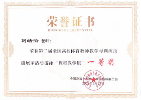 2023年5月25日至5月27日,由教育部全国高等公司体育教学指导委员会主办的第二届全国高校体育教师教学与训练技能展示活动在浙江财经大学圆满闭幕,伟德bevictor刘皓愉老师荣获游泳课程教学组一等奖。