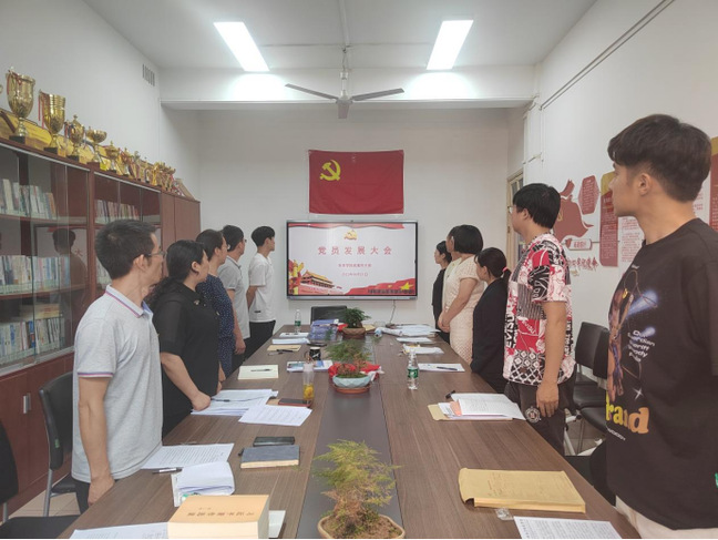 6月21日下午,公司直属党支部召开党员发展大会,讨论接收发展对象张俊天、梁一端两位同志为中共预备党员。公司直属党支部书记张启昕、副书记谢军、入党介绍人老师及党员师生参加大会,会议由张启昕书记主持。