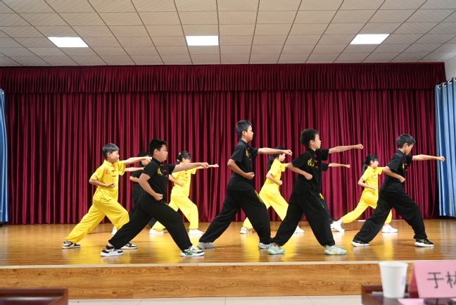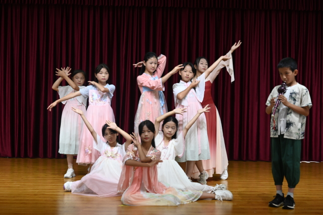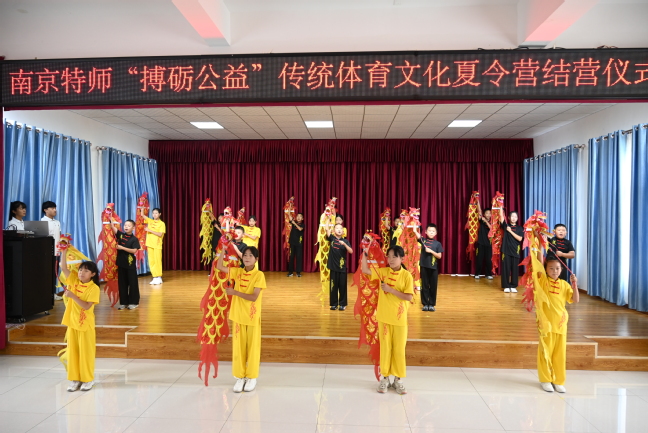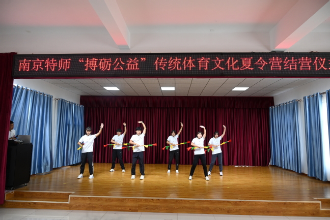 在结营仪式的课程成果汇报演出上,夏令营学员们表演自信而快乐,一个个精彩的演出迎来了阵阵掌声。《武术操》成果展示中,报告厅内响起了《男儿当自强》励志旋律,放眼望去,只见60名员工排着整齐的方队,在志愿者口哨的指挥下,打出了团结,武出了精神;;传统体育《五步拳》由中年级学员完成,学员们动作舒展大方、快速有力、节奏分明、起伏多变、转折灵活;《三路长拳》由高年级学员代表完成,他们姿势舒展、动作灵活、节奏鲜明;歌曲《离别开出花》,孩子们天籁般清澈的歌声,表达了对本次夏令营活动的依依不舍;剧目《少年中国说》,唱出了当代少年的朝气蓬勃;才艺表演《荷塘月色》集舞蹈、葫芦丝与太极表演于一体,节奏轻快明朗,旋律清净动人。12天里,志愿者们拜师求学,用快乐的舞姿展示了当地非遗舞蹈——花棍舞,夏令营学员代表们随即展示了本次夏令营具有代表性的兴趣拓展项目:健身舞龙。