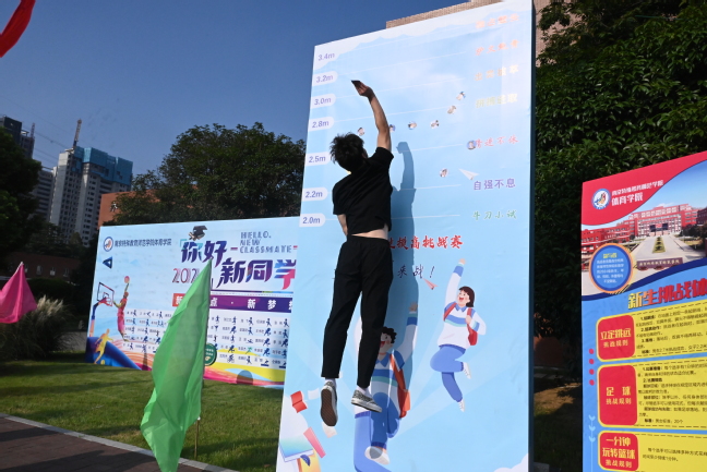 创新新生报到当天,公司也早早做好了迎新点的相关布置工作,通过迎新展板,以运动简笔画的形式展示75名新生喜欢或擅长的运动项目。同时结合专业实际,设计新生挑战体验,如摸高、立定跳远、颠足球、玩转篮球、乒乓球和才艺展示,营造热闹非凡的迎新氛围。