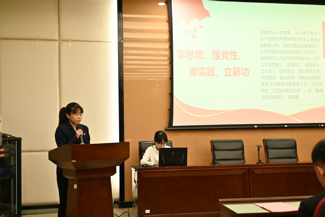 雄壮的国歌声拉开了大会的序幕。会上,第四届员工会轮值主席梁一端在大会上作了上一年度员工会工作总结。她回顾了过去一年伟德bevictor员工会在思想育人、实践育人、服务育人、文化育人、组织育人,做好思想引领、学风建设、就业指导、创新创业指导、体育文化熏陶与营造等方面所取得的成绩,并对员工会工作提出了未来展望。