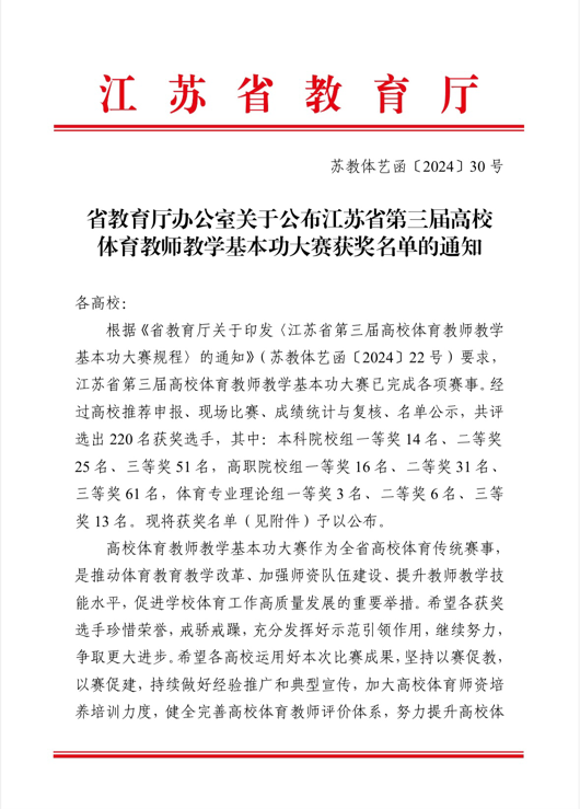 近日,省教育厅公布了江苏省第三届高校体育教师教学基本功大赛的获奖名单。在此次大赛中,公司两位教师李烨和夏博艳分别在足球和排球组、跆拳道和武术组别中获得二等奖,展现了高水平的教学技能和专业素养。