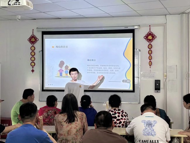 手工课上,志愿者还围绕“绳结的历史”展开文化知识讲解。借助图文并茂的材料,学员们了解了中国传统绳结的文化内涵和编织技巧。志愿者通过现场演示,让学员们近距离感受绳结艺术的魅力。这一环节不仅拓宽了学员们的知识面,也营造了轻松愉悦的学习氛围,增强了他们的文化认同感。
