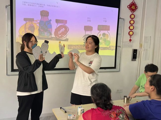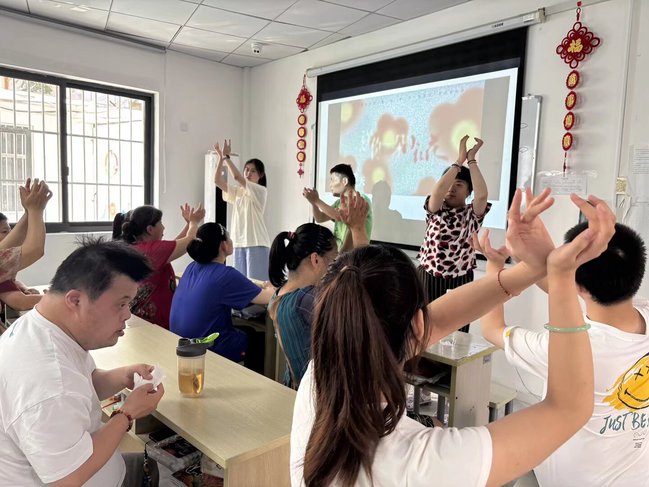 在肢体互动环节中,志愿者带领学员们跟随投影背景的指引,同步完成一系列手势动作。这一活动不仅锻炼了学员们的专注力和肢体协调能力,也增强了团队协作意识。在转盘游戏环节,学员们通过趣味问答和简单任务,在轻松愉快的氛围中提升了社交参与度。