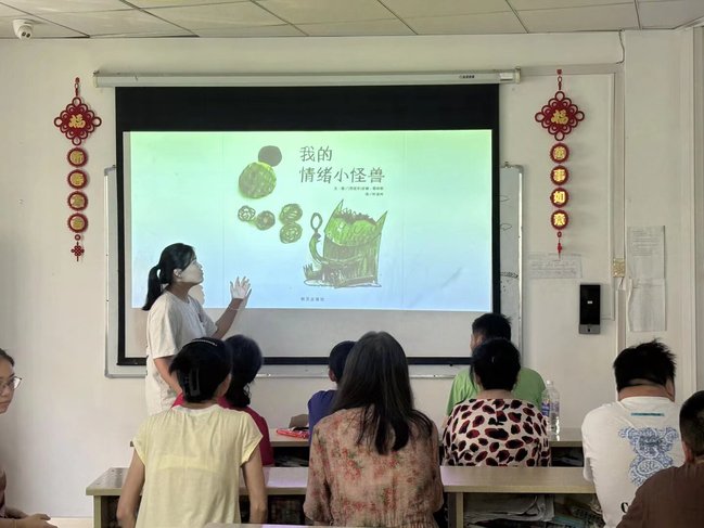 绘本课上,志愿者们以《我的情绪小怪兽》绘本为载体,通过生动的投影展示,引导学员们认识不同情绪的种类与表现形式。课堂中,志愿者以温和的语言和丰富的肢体动作,鼓励学员们主动表达内心的感受。“快乐像阳光,愤怒像火焰,悲伤像雨天……”在志愿者的引导下,学员们逐渐敞开心扉,分享自己的情绪体验。这种互动不仅帮助学员们更好地理解情绪,也为后续的心理支持奠定了基础。